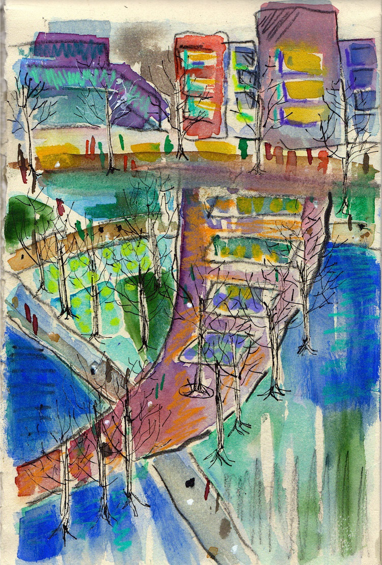 Park View, watercolor, ink, French crayon on paper, 12" x 8"